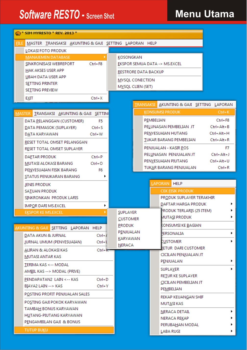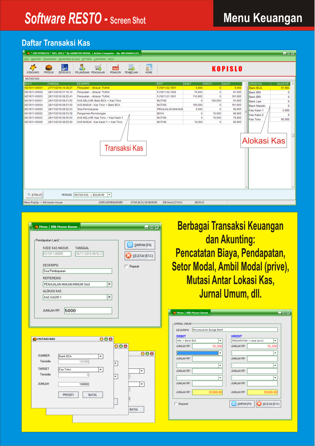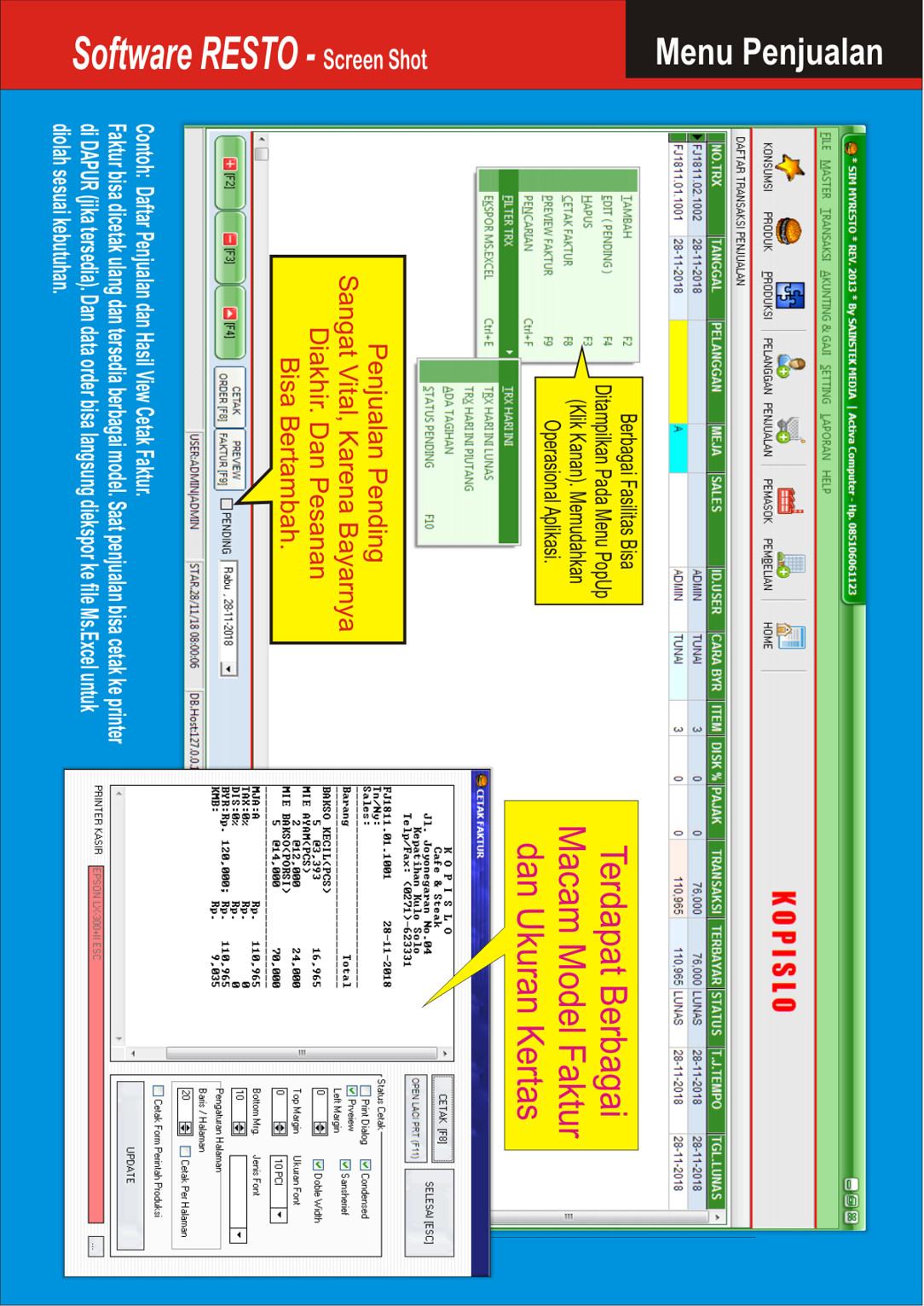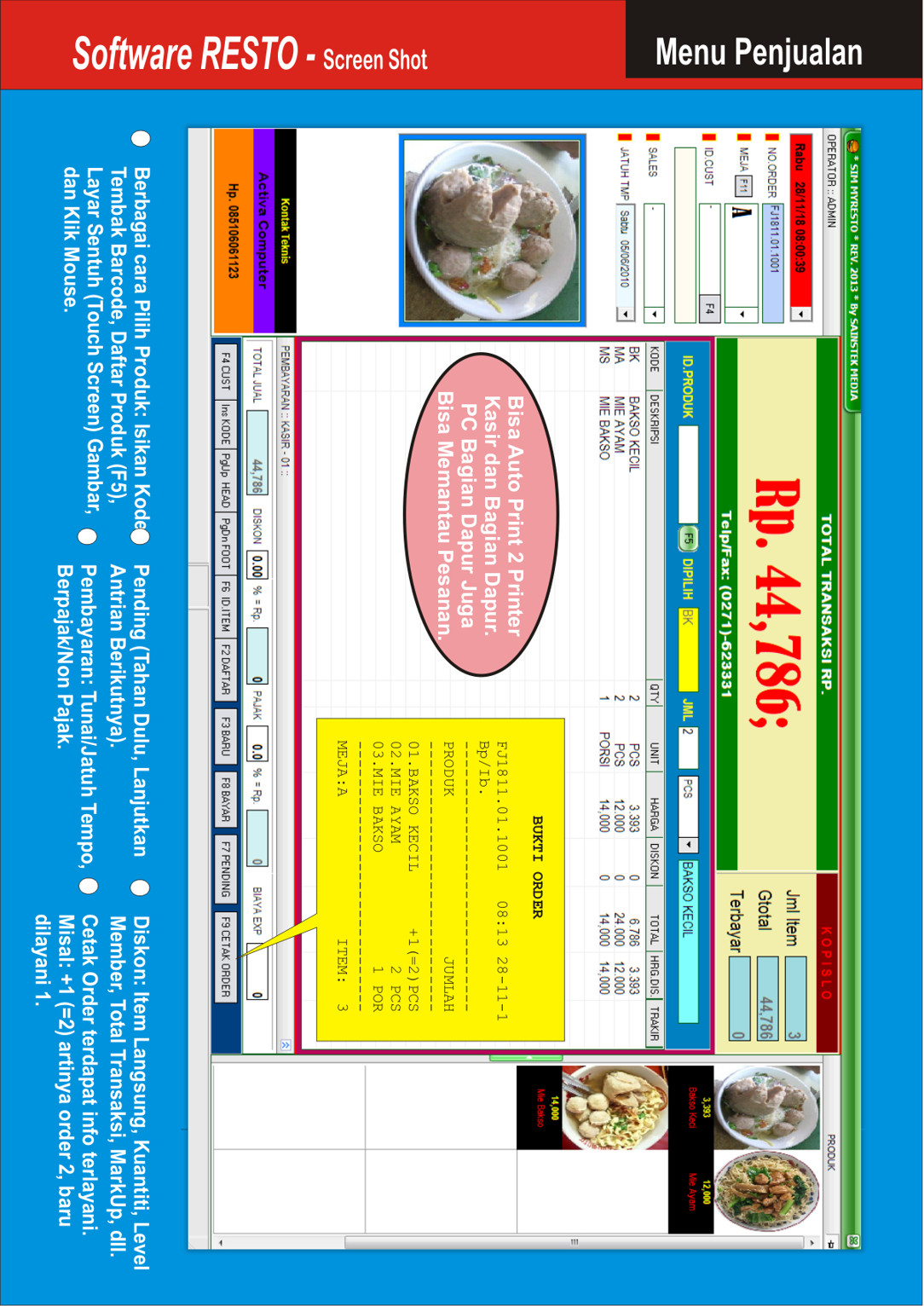 Aplikasi RESTO dilengkapi FOTO untuk memuddahkan layanan penjualan yaitu tinggal sentuh lauar (atau pakai mouse), lokasi meja, penambahan pesanan meja, penjualan toko (bisa barcode), hingga hutang piutang dan sistem akuntansi (autoposting). Juga terdapat 2 lokasi cetak printer, untuk kasir (mlti kasir) dan untuk dapur (realtime, otomatis mencetk saat ada pesanan dan bisa juga dikasih komputer).