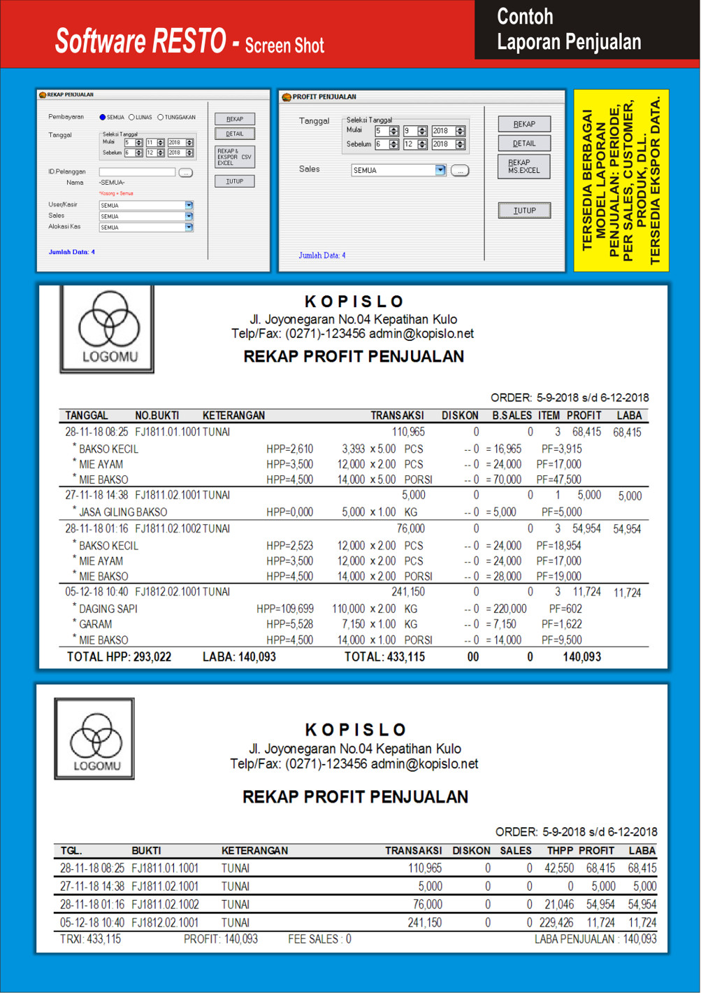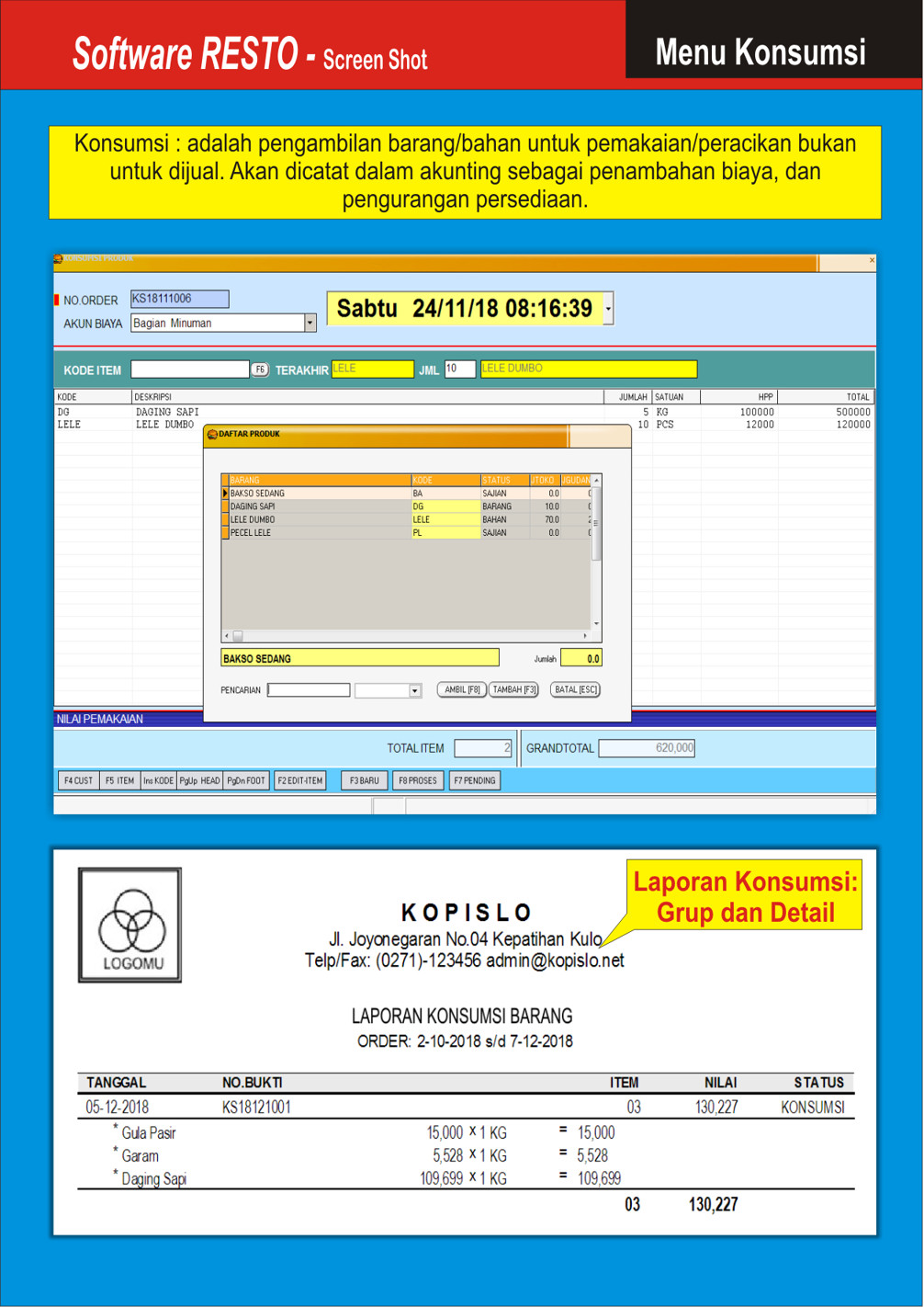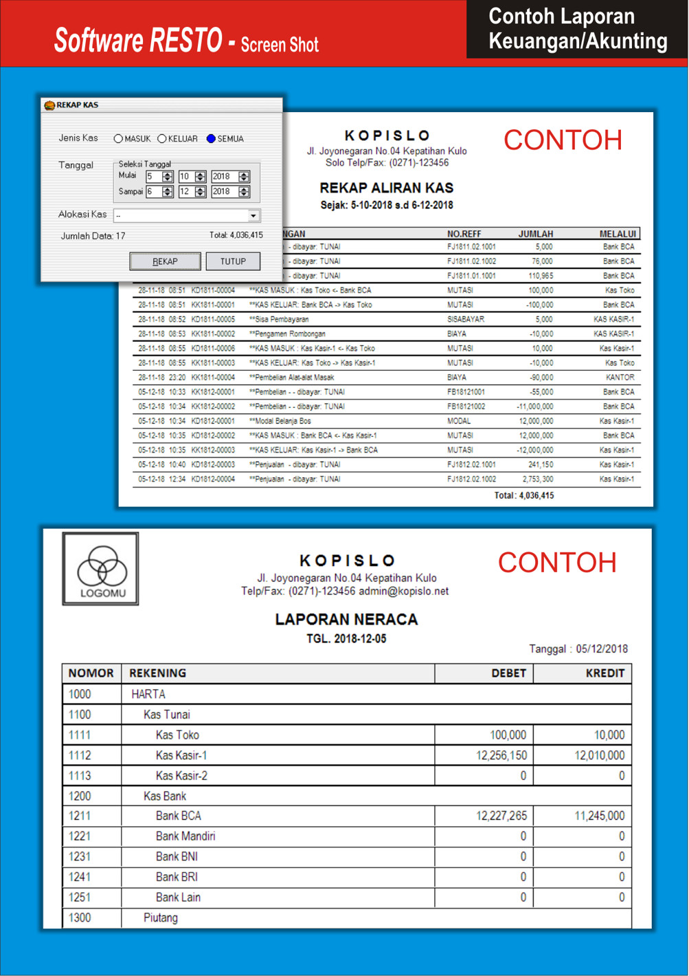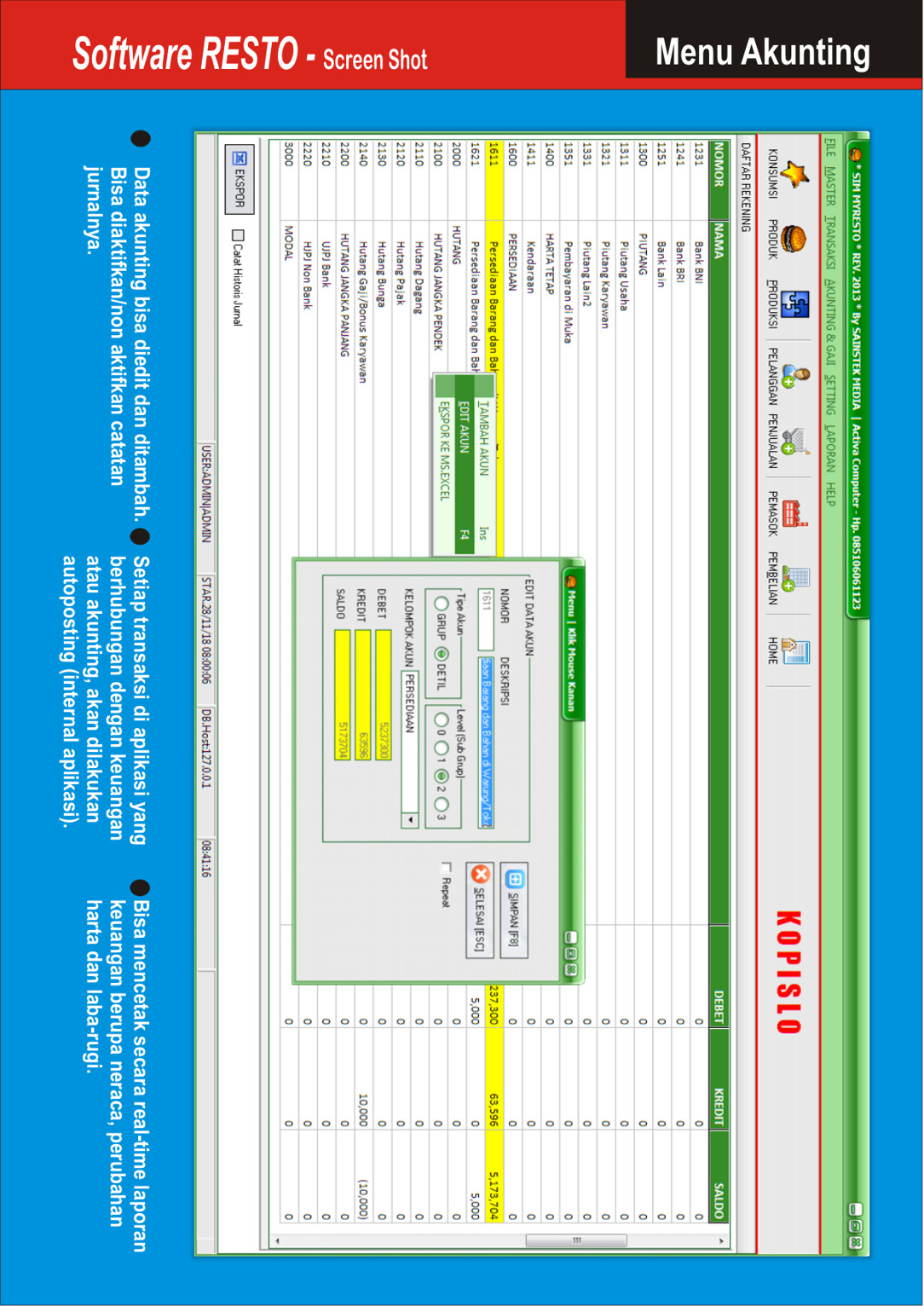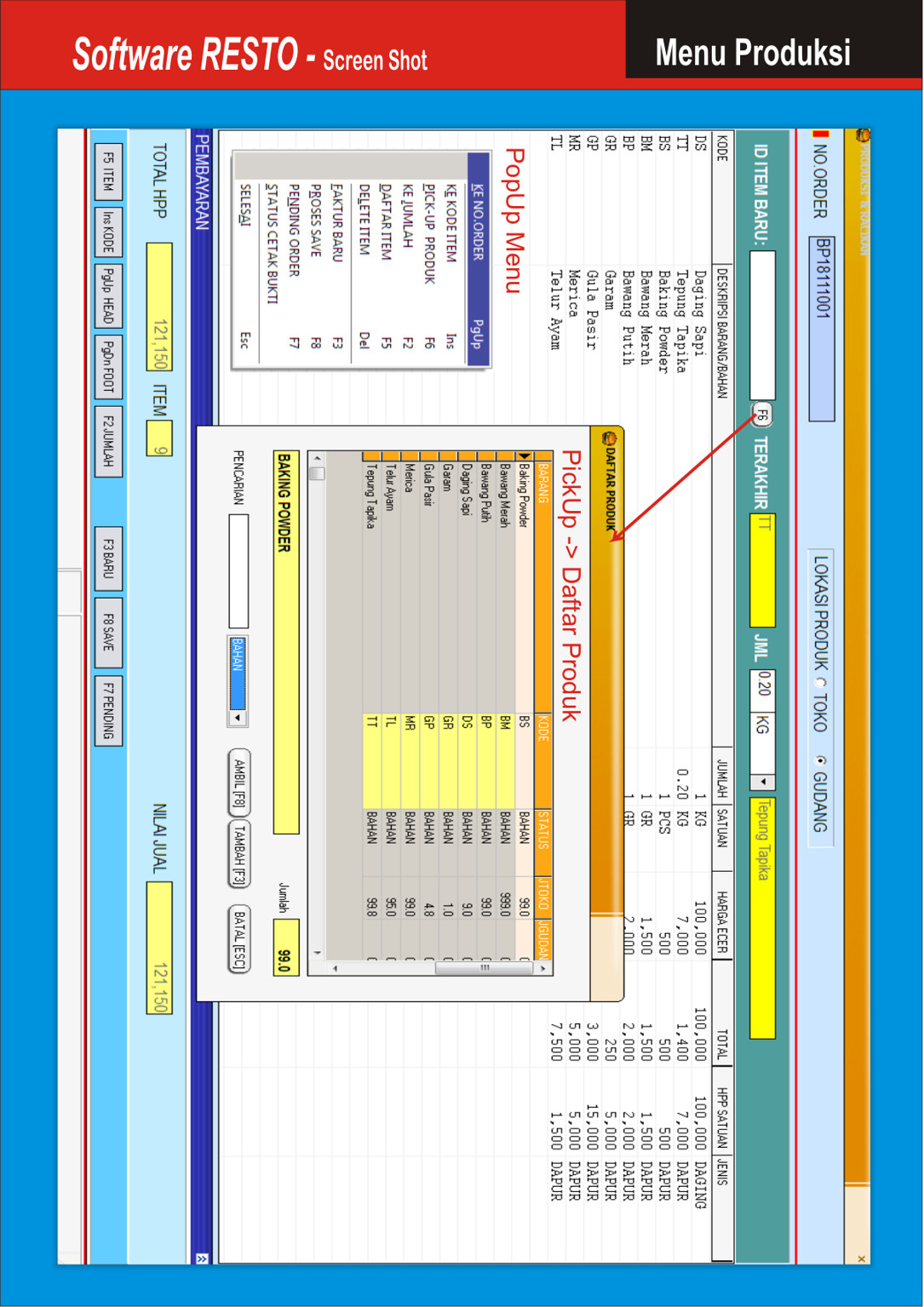 Aplikasi RESTO dilengkapi FOTO untuk memuddahkan layanan penjualan yaitu tinggal sentuh lauar (atau pakai mouse), lokasi meja, penambahan pesanan meja, penjualan toko (bisa barcode), hingga hutang piutang dan sistem akuntansi (autoposting). Juga terdapat 2 lokasi cetak printer, untuk kasir (mlti kasir) dan untuk dapur (realtime, otomatis mencetk saat ada pesanan dan bisa juga dikasih komputer).