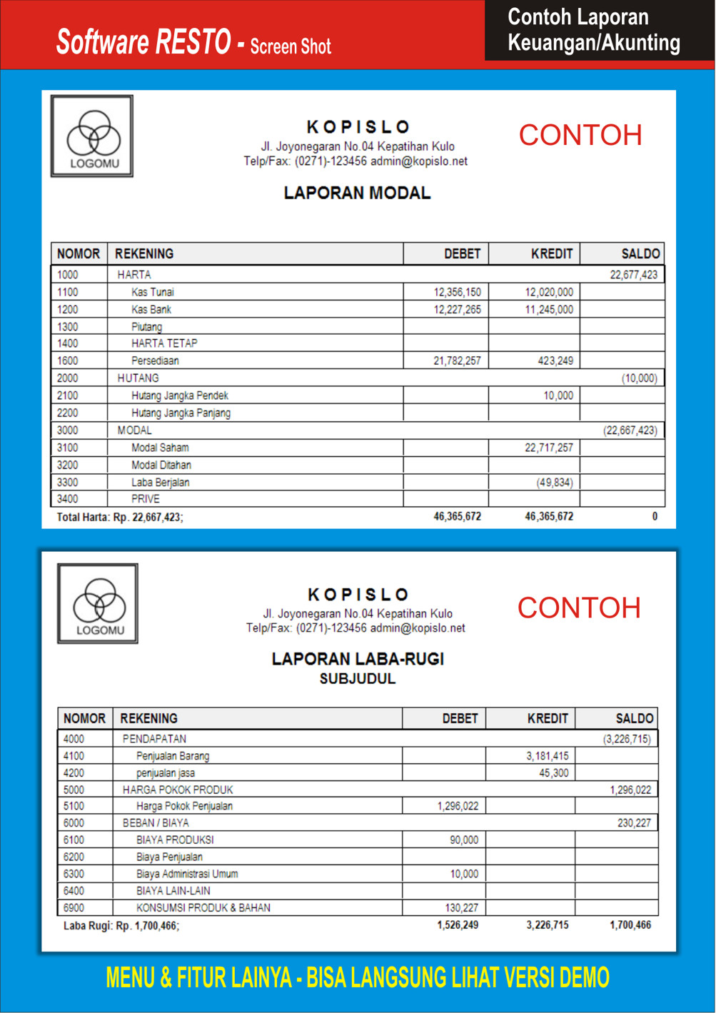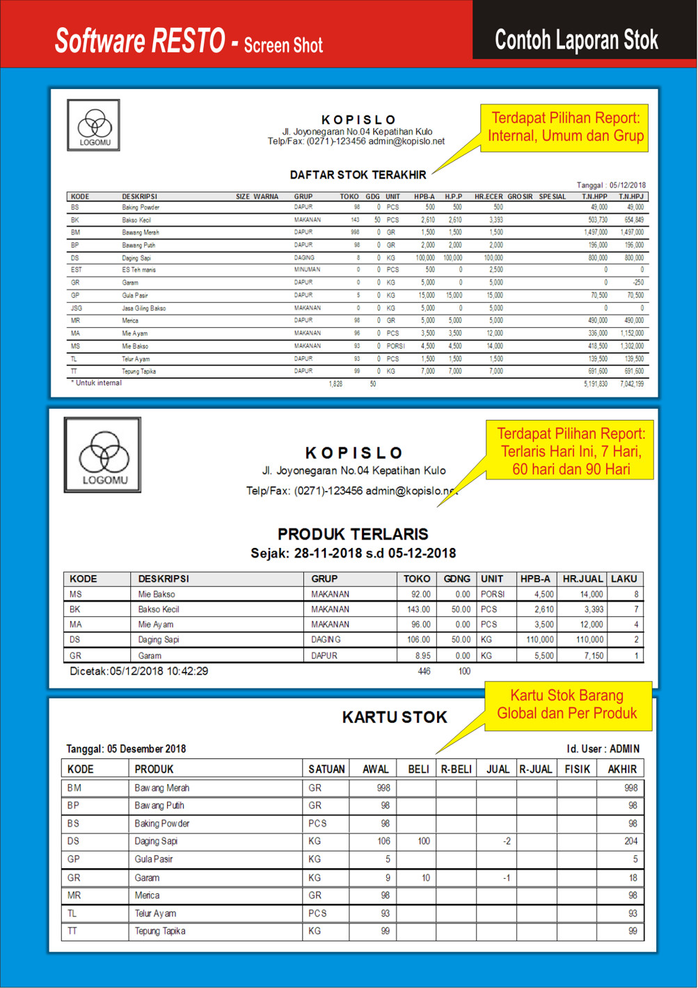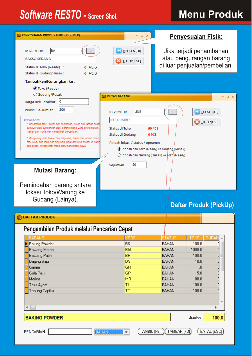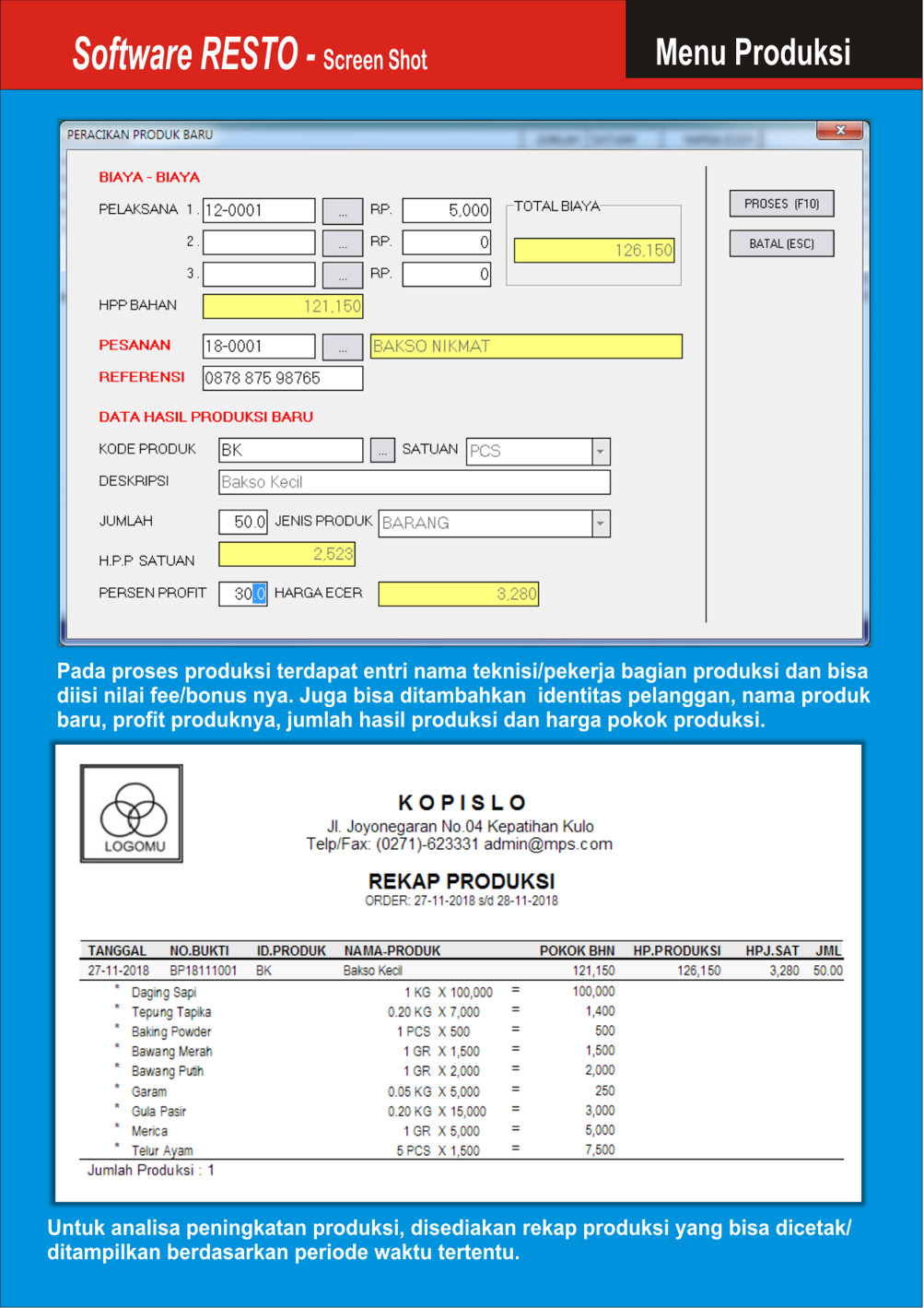 Aplikasi RESTO dilengkapi FOTO untuk memuddahkan layanan penjualan yaitu tinggal sentuh lauar (atau pakai mouse), lokasi meja, penambahan pesanan meja, penjualan toko (bisa barcode), hingga hutang piutang dan sistem akuntansi (autoposting). Juga terdapat 2 lokasi cetak printer, untuk kasir (mlti kasir) dan untuk dapur (realtime, otomatis mencetk saat ada pesanan dan bisa juga dikasih komputer).
